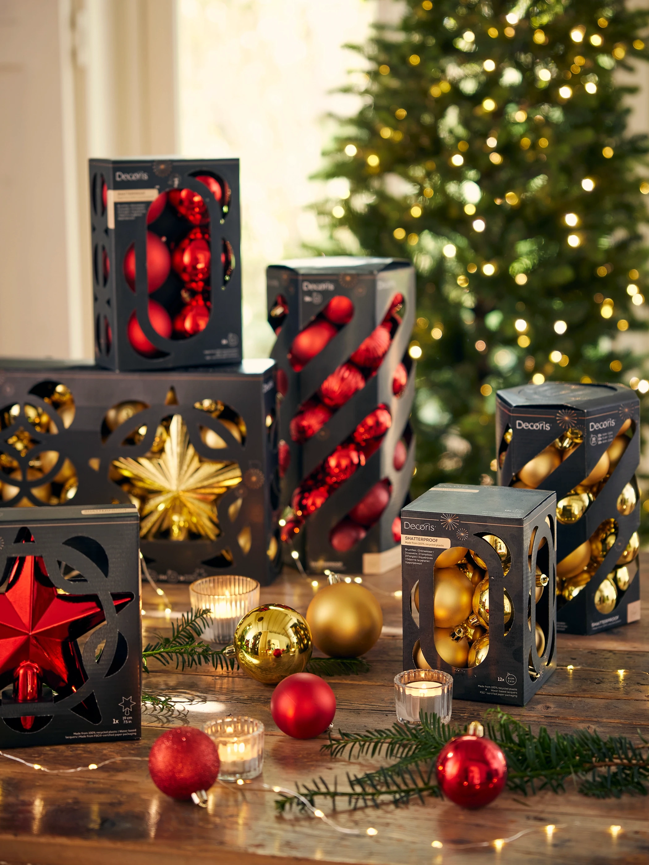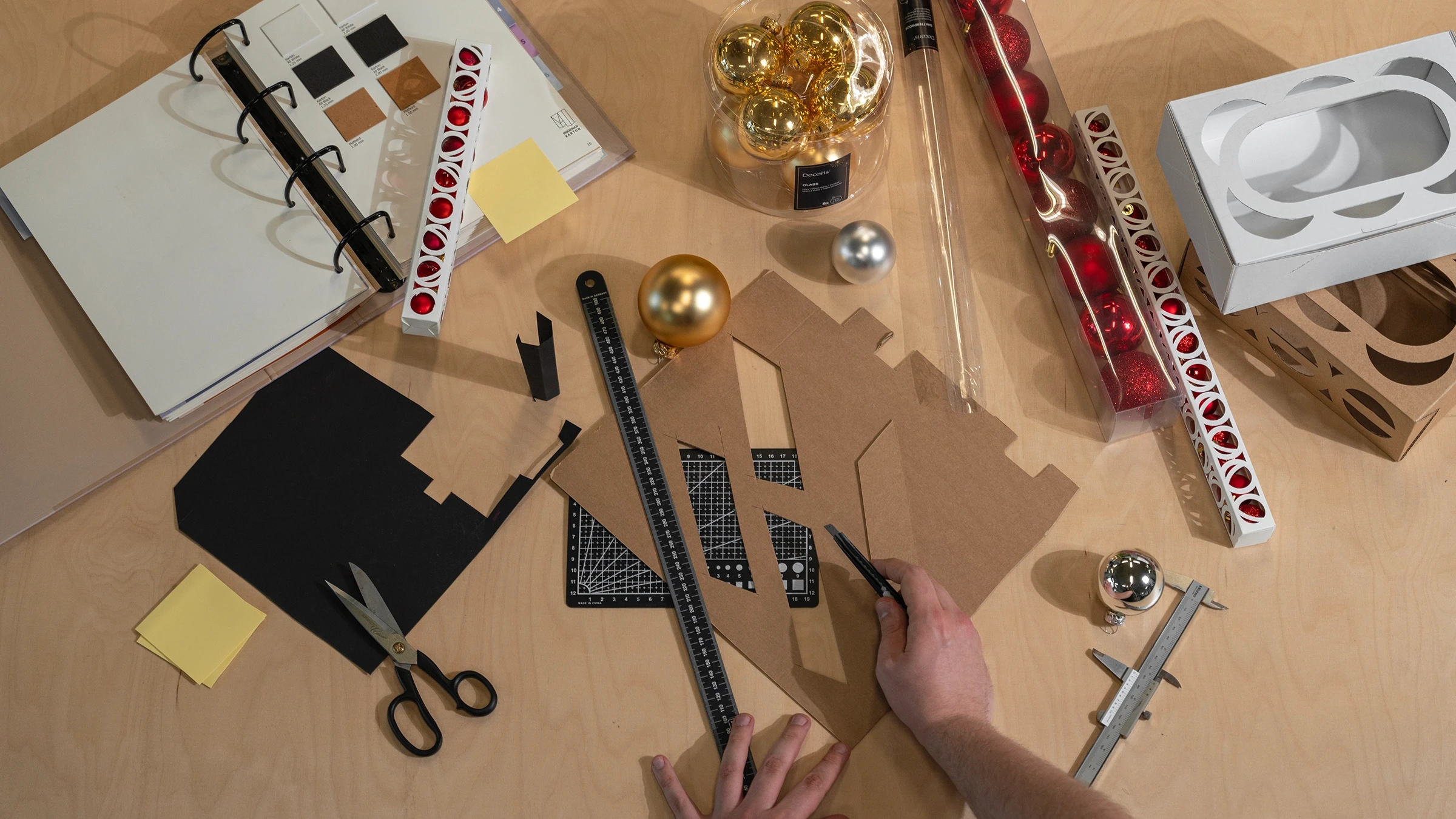 The concept was to translate the key benefits of plastic packaging, visibility and protection, into a cardboard-based solution. Rather than mimicking plastic tubes, we designed a structural system that leverages cardboard's inherent strength and formability. The construction prevents movement during transport and handling without requiring additional materials or plastic windows, while keeping all ornaments fully visible on shelf and providing a durable storage solution for the home.